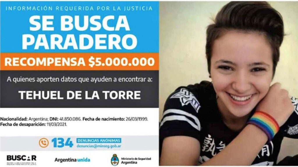 Mientras tanto, el Ministerio de Seguridad de la provincia de Buenos Aires mantiene una recompensa de 5.000.000 de pesos para quien pueda aportar información sobre el paradero de Tehuel de la Torre.
