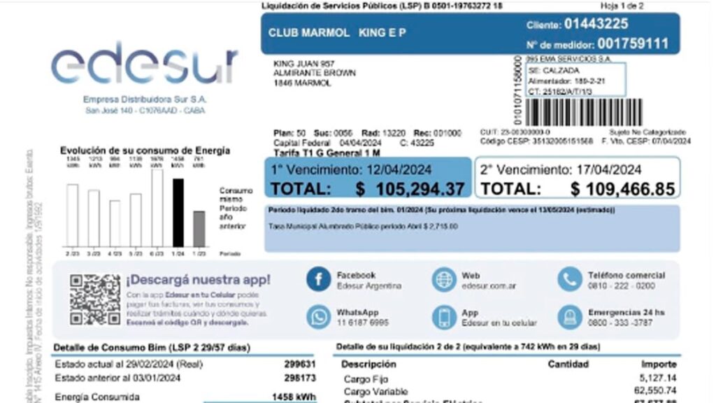 En abril, la boleta de luz llegó con un número exorbitante. El club Mármol debe pagar 105.294,37 pesos este mes, que se traduce en una aumento del 1.100 por ciento respecto al gasto de diciembre.