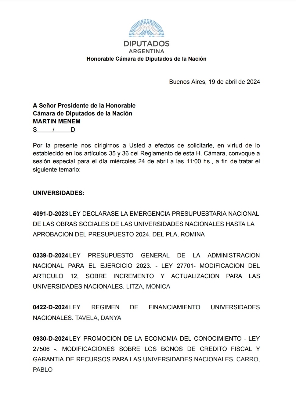 Ante el pedido de la prórroga para que la sesión comienza a las 11.45, Menen respondió: “Vamos a cumplir con el reglamento”. “Esta convocada la sesión para las 11 y a las 11.30 no está el quórum, se levanta”, agregó.