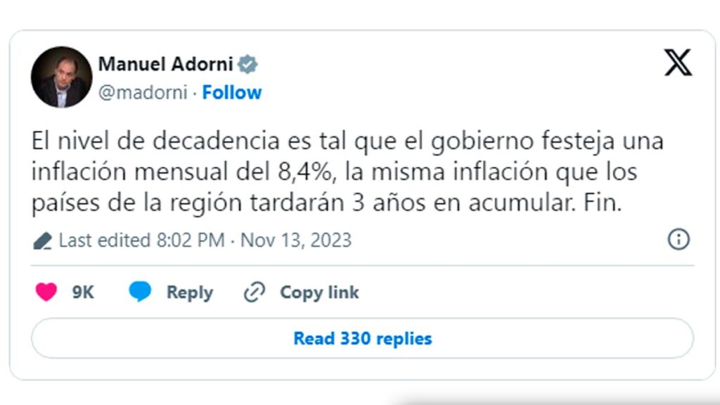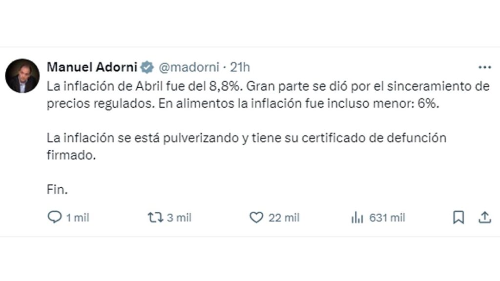 El funcionario nacional hizo eco del mensaje que adquirió viralidad en las últimas horas y que data de noviembre de 2023, cuando a través de su cuenta de X cuestionó la inflación que por aquel entonces era del 8,4%, incluso algunas céntimas menor al 8,8% registrado en el mes pasado.