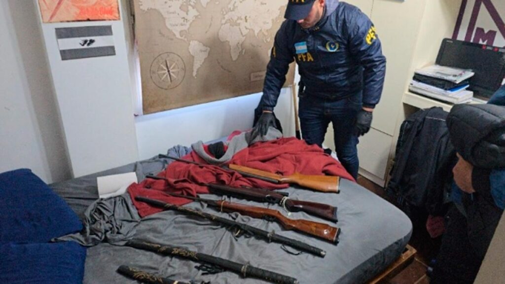 En la vivienda, la PFA secuestró armas, municiones y explosivos, entre ellas una pistola calibre 22 con balas, 6 cartuchos de escopeta, tres granadas de gas de hostigamiento, una bengala de humo, varias armas de aire comprimido, katanas y otras armas blancas de distintos tamaños, una faca.