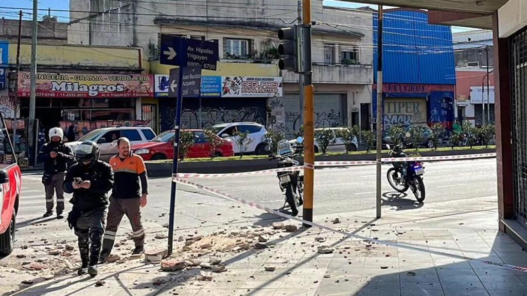 La mampostería se desprendió de la parte superior de un edificio ubicado en la avenida Hipólito Yrigoyen y Azopardo, en Lanús.