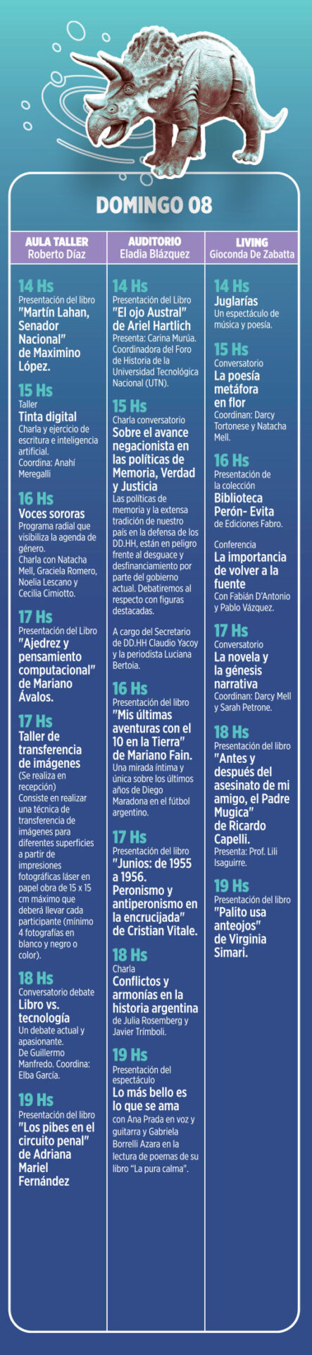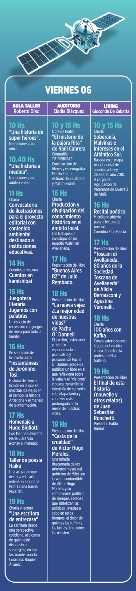 Habrá actividades en el Aula taller Roberto Díaz, el Living Gioconda de Zabatta y el Auditorio Eladia Blázquez.