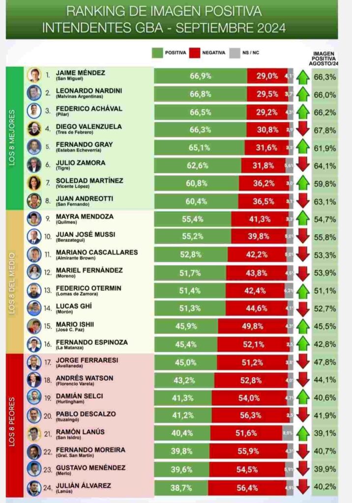 De esa manera, quien se posicionó con la mejor imagen fue Jaime Méndez (San Miguel), con un 66,9% de imagen positiva y 29% negativa. El resto del podio lo completaron dos intendentes de Unión por la Patria (UxP): Leonardo Nardini (Malvinas Argentinas), con un apoyo del 66,8% y rechazo del 29,5%, y Federico Achával (Pilar), con un 66,5% y 29,2% respectivamente.