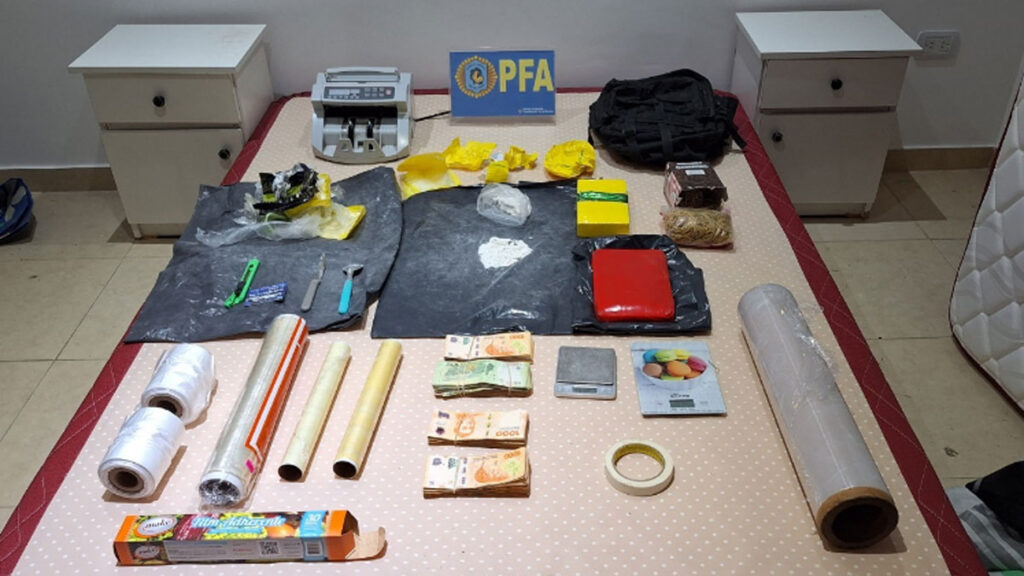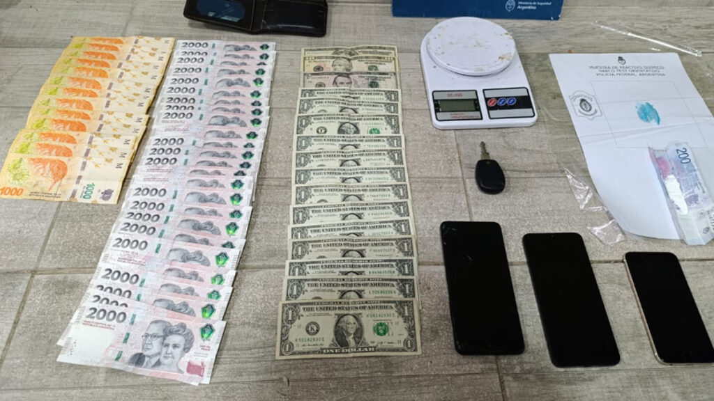 Además, encontraron 783.580 pesos, seis vehículos entre autos y camionetas, tres balanzas de precisión, catorce teléfonos celulares, dos máquinas de contar billetes y un cuaderno con anotaciones varias, entre otros elementos de interés para la causa.