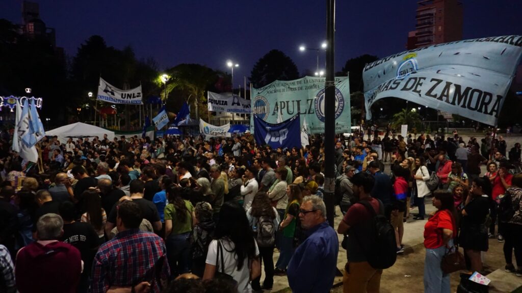Este miércoles, alumnos, docentes y no docentes de la Universidad Nacional de Lomas de Zamora (UNLZ) participaron de una jornada en defensa de la educación pública en la Plaza Grigera, Lomas de Zamora. La actividad contó con la presencia también de graduados y vecinos, en respaldo a la universidad en el marco del veto presidencial a la ley de financiamiento educativo.