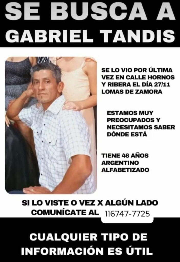 Continúa la búsqueda de datos sobre el paradero de Gabriel Tandis, de 46 años, el pintor que salió de su casa de Villa Fiorito, partido de Lomas de Zamora, en la mañana del miércoles 27 de noviembre para ir a trabajar y nunca volvió.