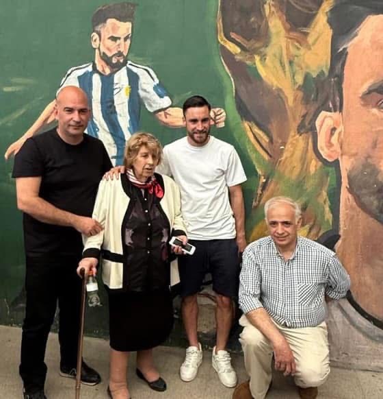 El jugador fue recibido con una multitud de vecinos de Rafael Calzada y luego posó junto al mural en su honor.