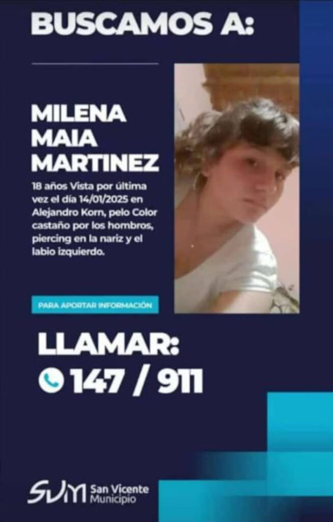 Buscan a Milena Maia Martínez, una adolescente quien salió de su casa en Alejandro Korn, partido de San Vicente, el martes alrededor de las 9 rumbo a la casa de una amiga pero, horas después, fue vista en el aeropuerto de Ezeiza acompañada por un hombre y creen que viajó a Chile.