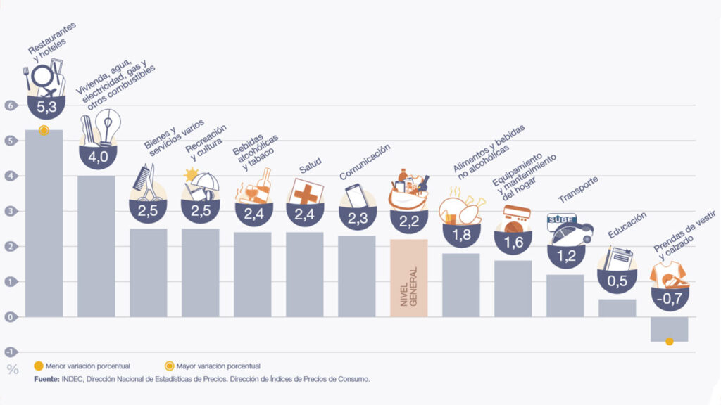 El informe del Indec destacó que la división con mayor aumento mensual fue Restaurantes y hoteles, con un 5,3%. En segundo lugar se ubicó el sector de Vivienda, agua, electricidad, gas y otros combustibles, que subió un 4% debido a los incrementos en alquileres y servicios públicos. También registraron alzas importantes Bienes y servicios varios y Recreación y cultura, ambos con un 2,5%. Por su parte, Bebidas alcohólicas y tabaco y Salud aumentaron un 2,4% cada uno, mientras que Comunicación lo hizo en un 2,3%.