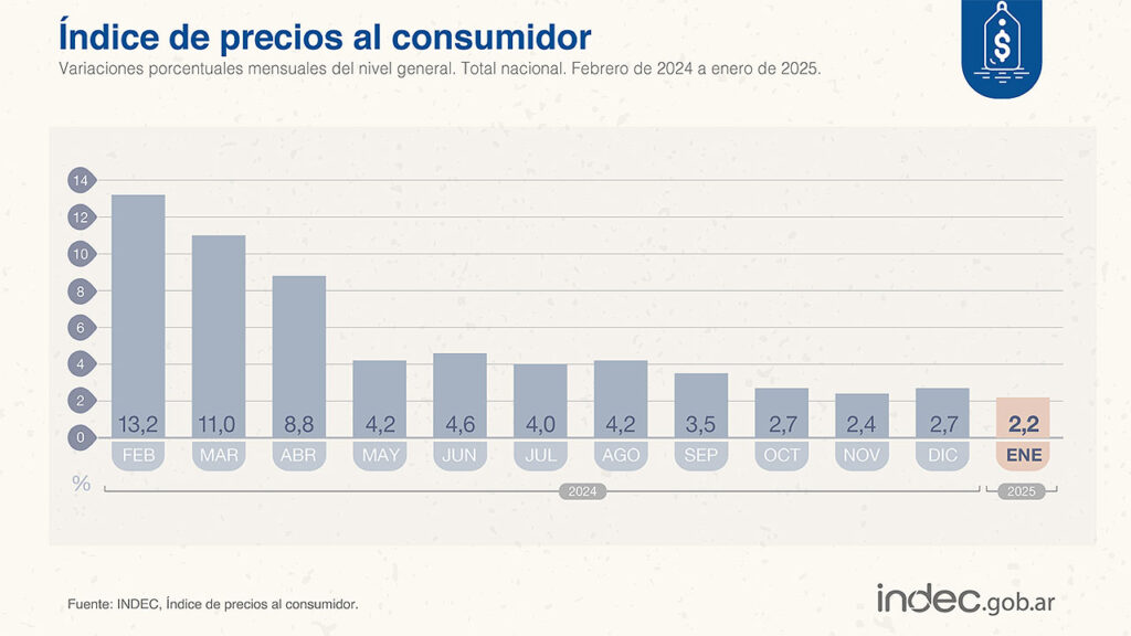 El Instituto Nacional de Estadística y Censos (Indec) informó este jueves que la inflación de enero de 2025 fue del 2,2% respecto de diciembre de 2024, lo que implica que retomó el sendero de la desaceleración. En el último mes del año pasado el Índice de Precios al Consumidor (IPC) había registrado un incremento de 2,7%.