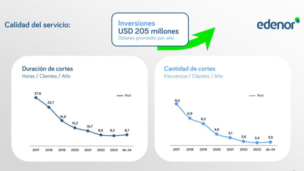 A lo largo de los últimos siete años, Edenor logró reducir progresivamente la cantidad y duración de los cortes. En 2017, sus clientes sufrían 9 cortes al año, con una duración acumulada de 27,6 horas. En 2024, esos valores descendieron a 3,5 cortes y 8,7 horas respectivamente.
