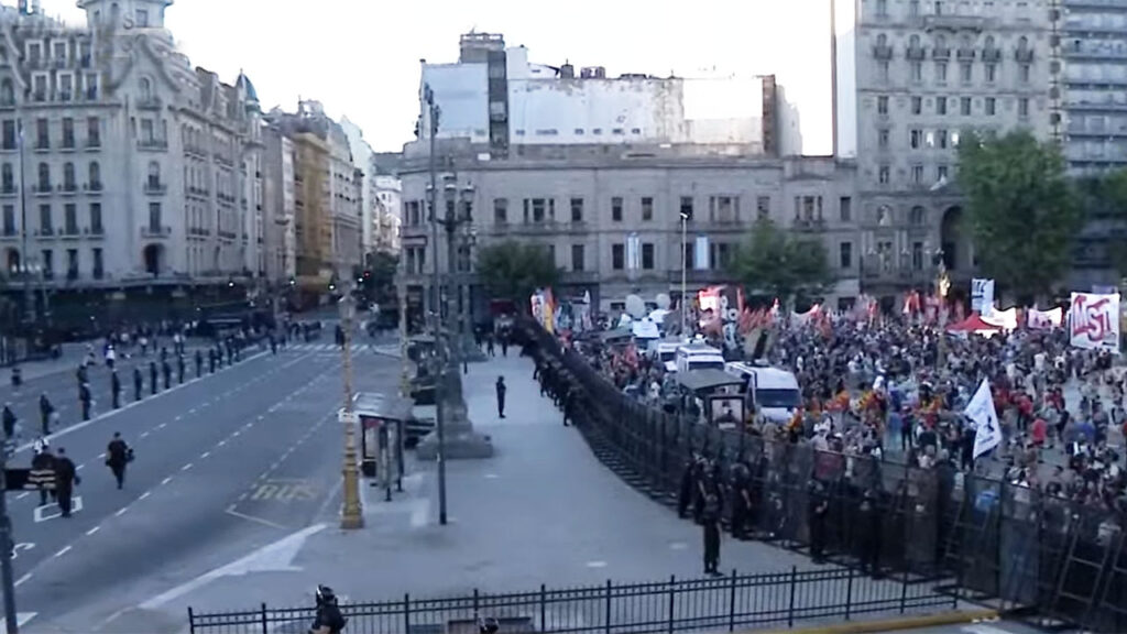 La mañana había comenzado con imágenes orwellianas en las estaciones de tren de toda el Área Metropolitana de Buenos Aires, donde las pantallas habitualmente utilizadas para informar sobre horarios ferroviarios y los altoparlantes, con una voz monocorde, anunciaban que las fuerzas de seguridad reprimirían cualquier “ataque a la República”.