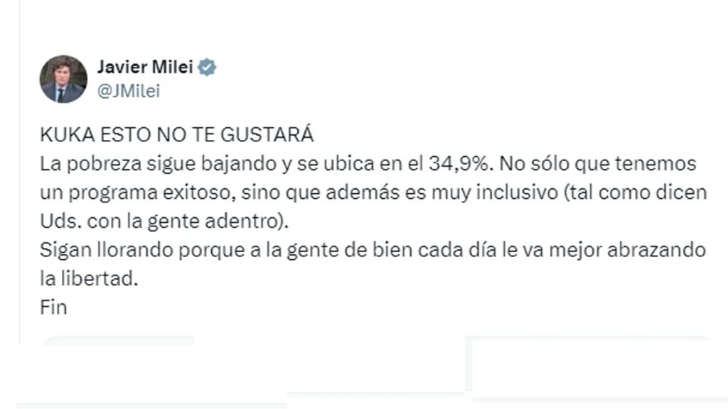 “Kuka esto no te gustará”, comienza el mensaje posteado recientemente, que alude al descenso de la pobreza en el cierre de 2024.