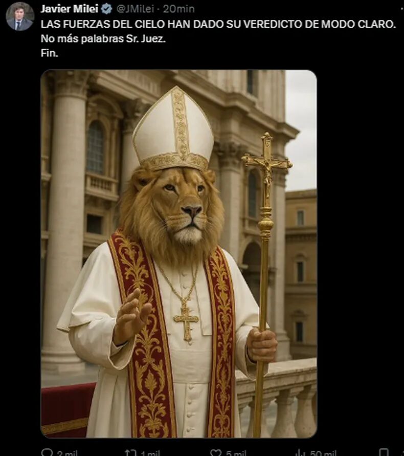 El presidente Javier Milei celebró la designación del estadounidense Robert Prevost como el nuevo papa de la Iglesia Católica con una inverosímil publicación en sus redes sociales. “Las fuerzas del cielo han dado su veredicto de modo claro. No más palabras Sr. Juez. Fin”, escribió el mandatario en una publicación acompañada por una imagen generada por inteligencia artificial donde se ve un león vestido de sumo pontífice, en alusión al nombre que eligió Prevost para su papado, que fue el de León XIV.