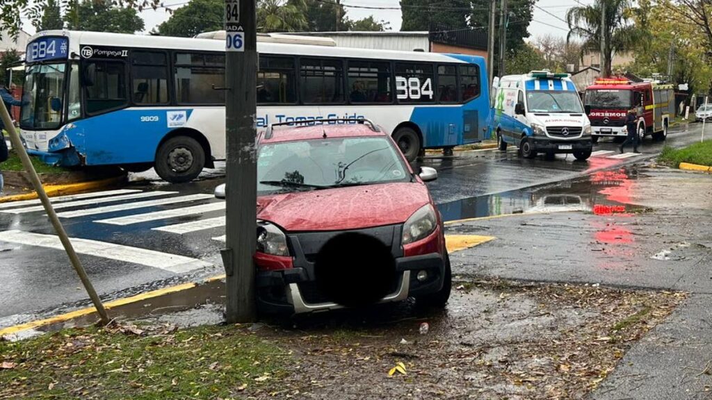 De acuerdo a lo informado por los Bomberos Voluntarios de Almirante Brown, “un colectivo y un auto, evitaron chocar en momentos en que intentaban cruzar por Bynnon y 25 de Mayo (José Mármol), pero el asfalto resbaladizo por la lluvia hizo que terminaran chocando”. La unidad de la línea 384 terminó impactando contra un cantero y auto envistió un poste.