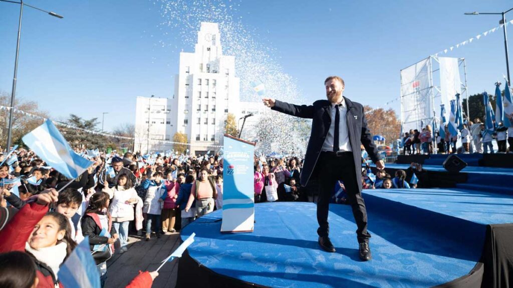 Durante su discurso, el intendente convocó a los chicos y chicas a “amar la Bandera como hijos de la Patria”, y afirmó que “ser belgranianos es ser buenos compañeros, amigos y hermanos, tratándonos bien y cuidando esta tierra de personas solidarias, patriotas y valientes”.