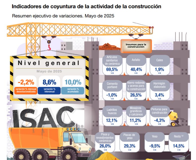 En los primeros cinco meses de 2025, el indicador sintético de la actividad de la construcción (ISAC) acumuló una suba del 10% interanual, lo que refleja una recuperación sostenida respecto al mismo período del año pasado.