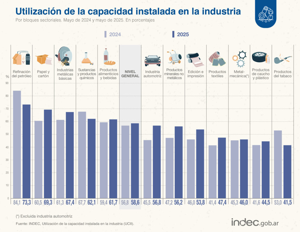 El uso de la capacidad instalada en la industria alcanzó el 58,6% en mayo, según informó este martes el Instituto Nacional de Estadística y Censos (INDEC). El dato representa apenas un aumento de tan solo el 0,3 puntos porcentuales respecto de abril (58,3%), lo que confirma el estancamiento de la actividad industrial.