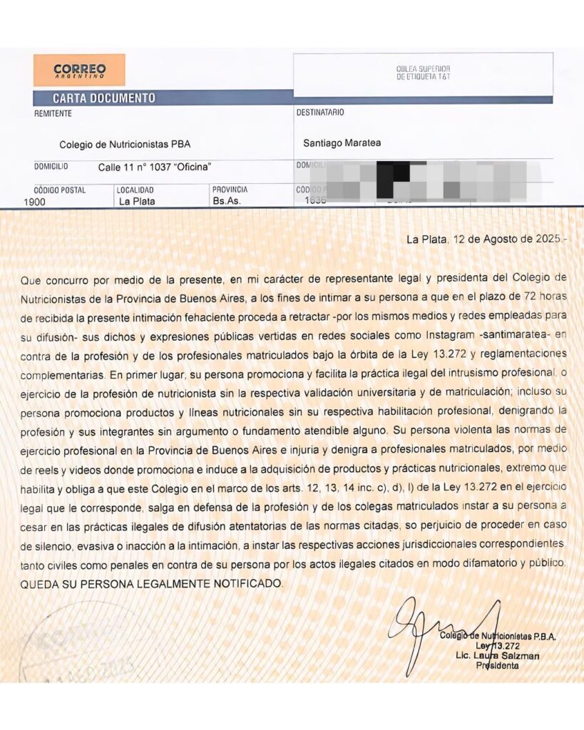 El Colegio de Nutricionistas de la Provincia de Buenos Aires denunció al influencer Santiago Maratea por su accionar agraviante, irresponsable e intrusivo y, a través de una carta documento, le exigió que se retracte de los dichos y expresiones vertidas en sus redes sociales, principalmente en Instagram.