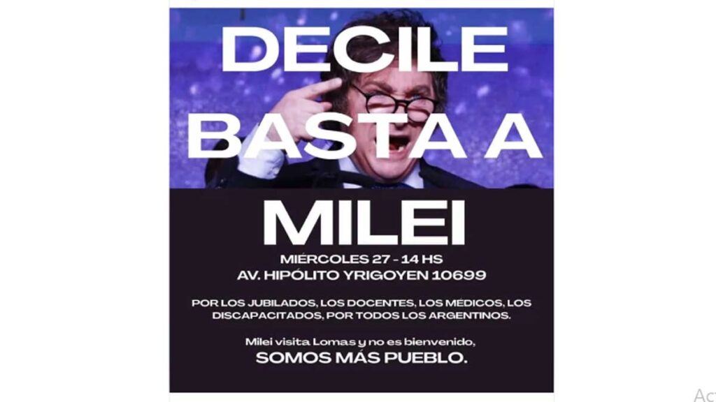 El punto de encuentro es la avenida Hipólito Yrigoyen 10.699 de Lomas de Zamora, a las 14. “Por los jubilados, los docentes, los médicos, los discapacitados, por todos los argentinos”, indica la invitación a la protesta. “Milei visita Lomas y no es bienvenido”, es el mensaje concreto.