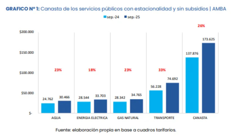 De acuerdo al estudio, en septiembre un hogar promedio del AMBA, sin subsidios, destinó $173.625 para cubrir gastos de transporte, electricidad, gas y agua potable. Este valor representó una caída mensual del 7,7% por efecto de la estacionalidad, pero se ubicó un 26% por encima del mismo mes de 2024, aunque todavía por debajo de la inflación interanual estimada en 31%.