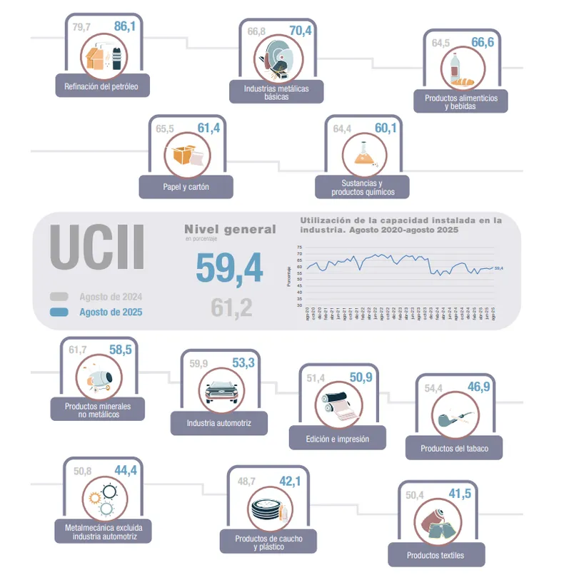La utilización de la capacidad instalada industrial se ubicó en 59,4% durante agosto, de acuerdo con el informe difundido por el Instituto Nacional de Estadística y Censos (INDEC). La cifra representa una baja interanual frente al 61,2% registrado en agosto de 2024, aunque muestra una leve mejora respecto de julio de 2025, cuando se había ubicado en 58,2%.