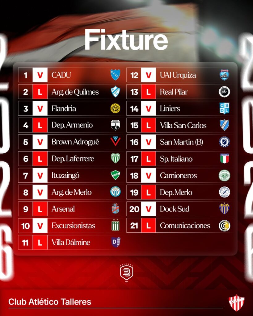 El club Talleres compartió el fixture que tiene por delante en la competencia de la Primera B. Debuta ante Defensores Unidos y el primer partido en el Pablo Comelli será contra Argentino de Quilmes, en la segunda fecha.