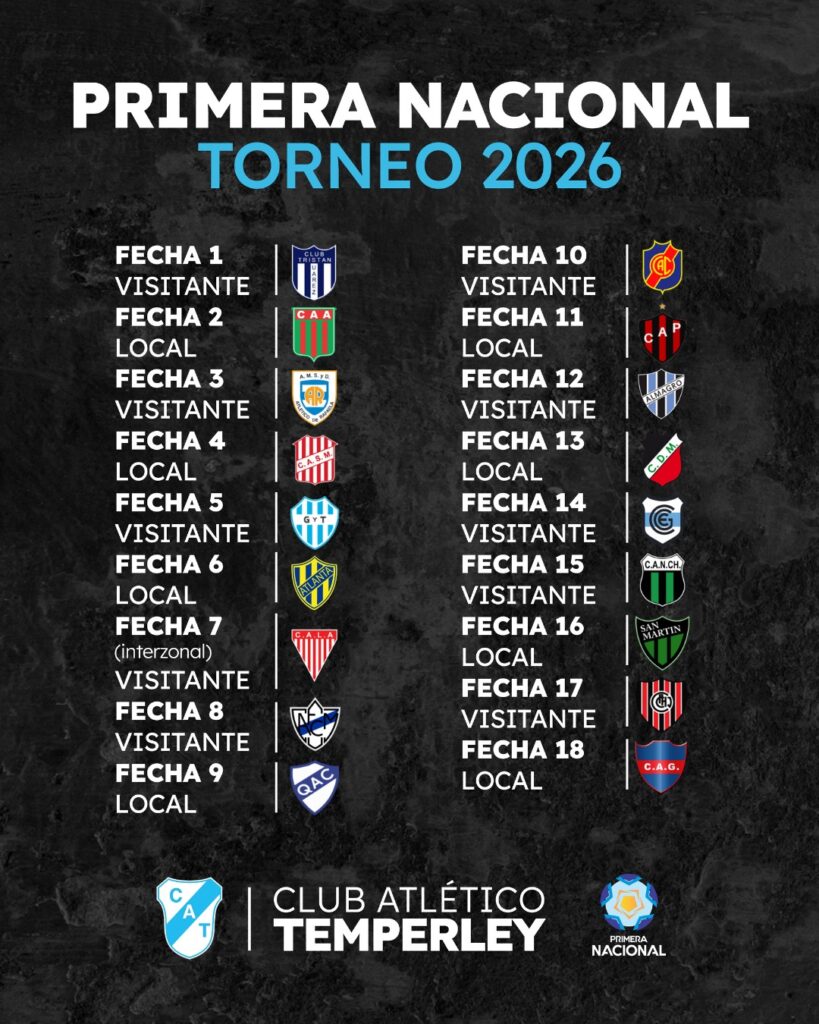 Ya se anunció el fixture de la Primera Nacional y Temperley conoció a sus rivales para el debut, que será fuera de casa, y el primero de local.