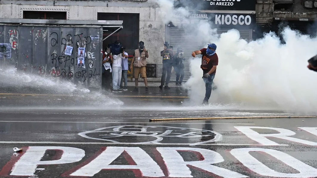 La Policía abocada al operativo de seguridad en las inmediaciones del Congreso dispersó a manifestantes con camiones hidrantes y gases lacrimógenos, luego de que estos arrojaran piedras y botellas contra los uniformados.