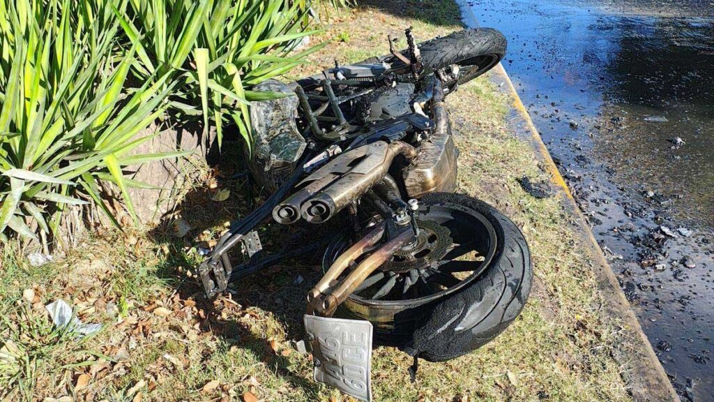 Longchamps: perdió el control, cayó de la moto y se le prendió fuego