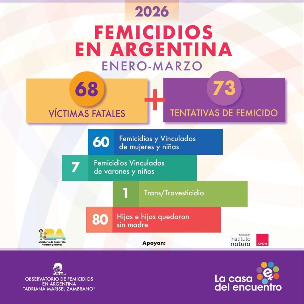 El Observatorio de Femicidios Adriana Marisel Zambrano, coordinado por la Asociación Civil La Casa del Encuentro, presentó los datos correspondientes al período comprendido entre el 1° de enero y el 31 de marzo de 2026. El informe revela una situación crítica en materia de violencia de género, contabilizando un total de 73 tentativas de femicidio a nivel nacional.