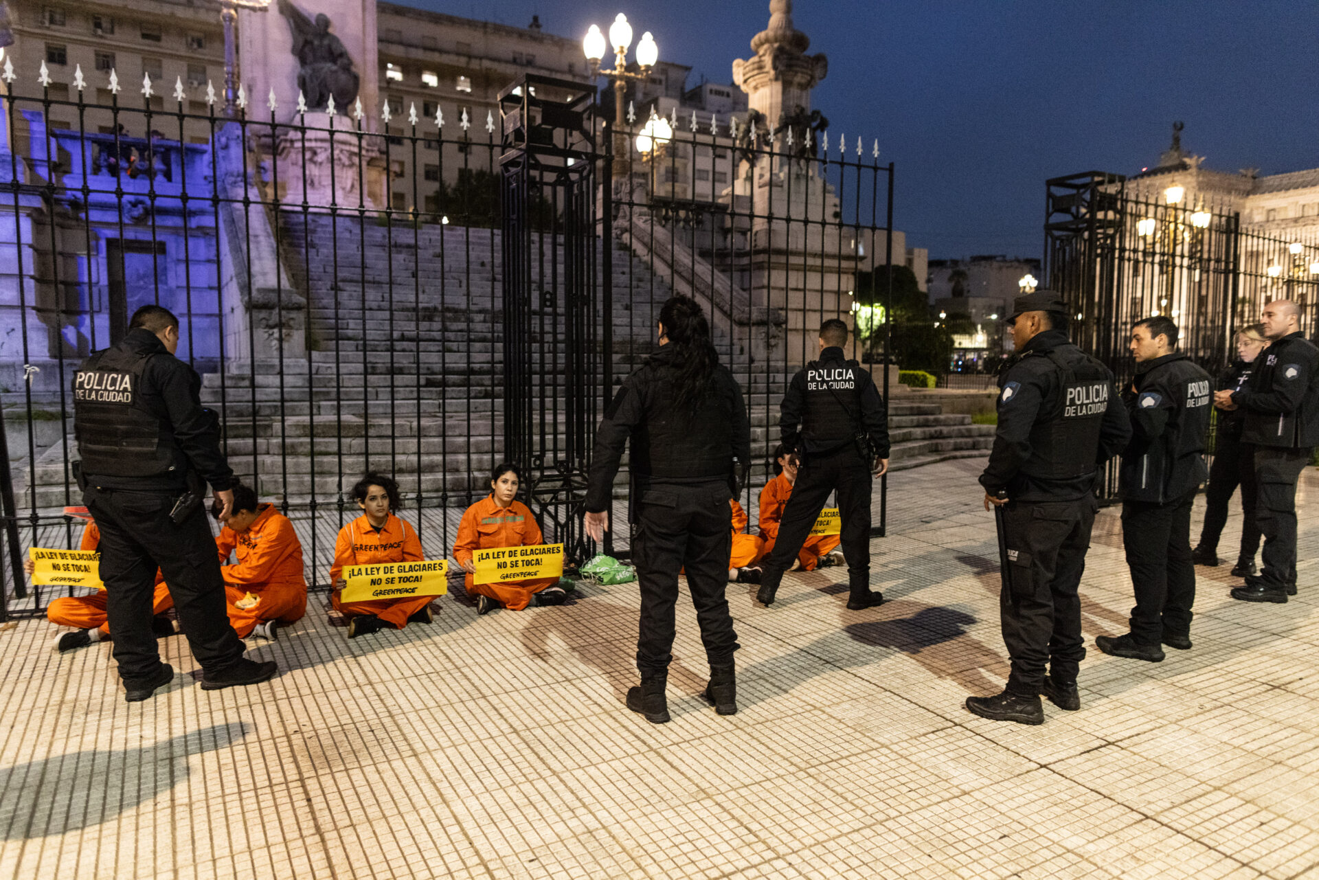 “Diputados, no traicionen a los argentinos. La Ley de Glaciares no se toca”, reza el cartel que la agrupación Greenpeace colocó bien temprano, como forma de protesta a la intención de la administración libertaria.
